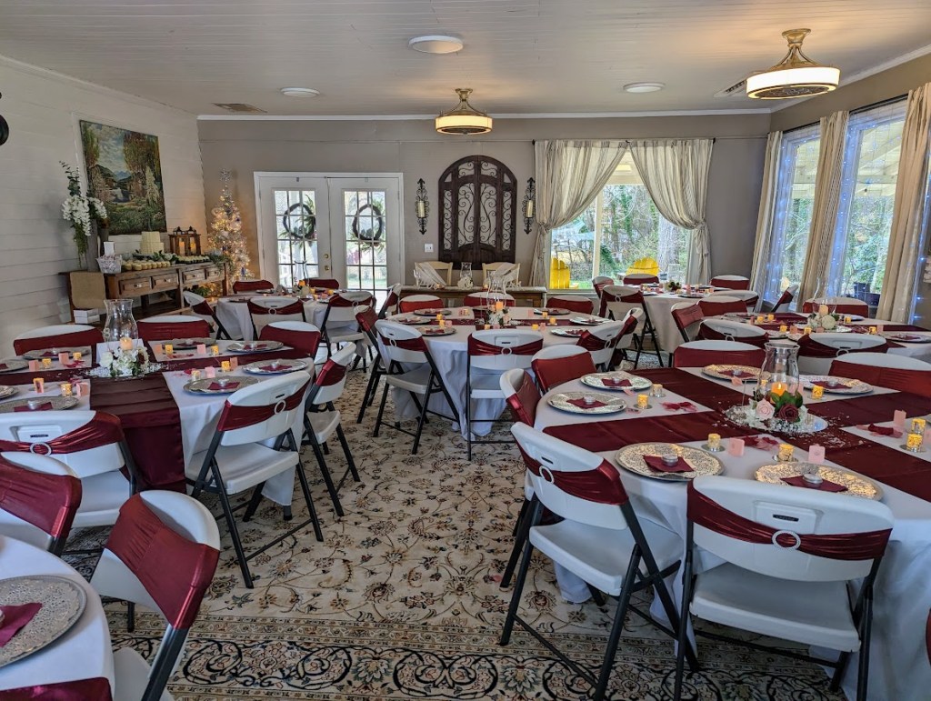 The Historic Farmhouse is built around a frontier log cabin and features original heart pine floors and six fireplaces.The original log cabin inside the Farmhouse is a cozy meeting place for guests.The Guest Lounge is a quiet space for relaxing, reading or watching television,The Farmhouse Kitchen Prep Area is available for caterers,The expansive kitchen includes a stainless steel prep table and wash area for caterers. (No cooking allowed)The Farmhouse Event area is ideal for intimate events, lectures, group meetings and family reunions.For relaxation enjoy the Celebration of Life Fountain Bring a bookand sit by the Reflection Pond.